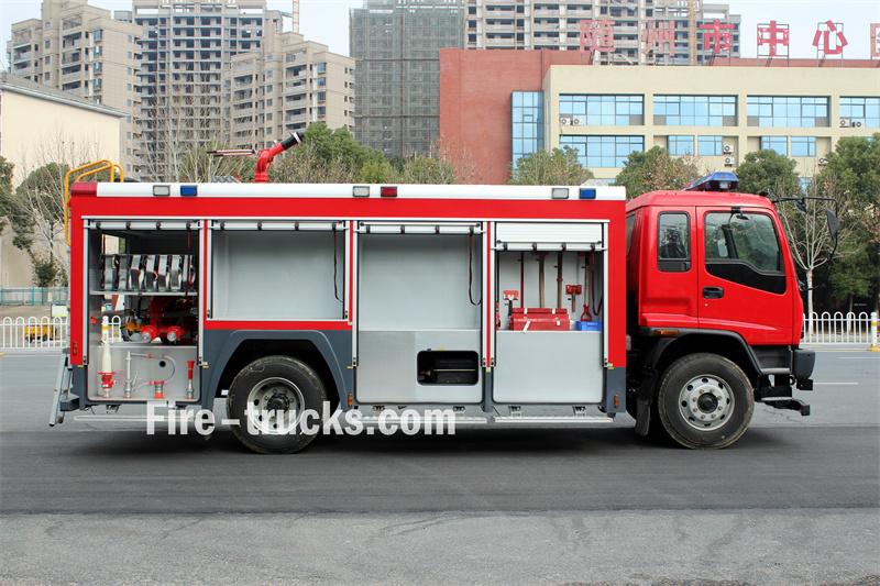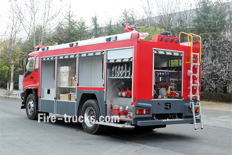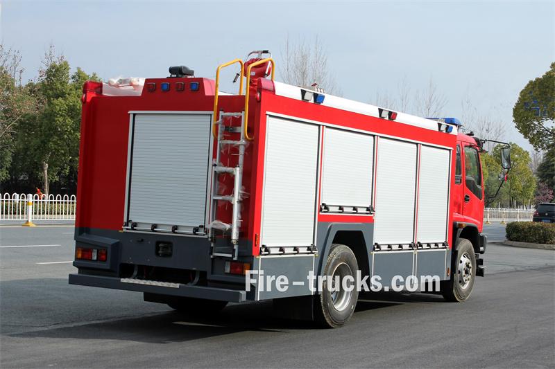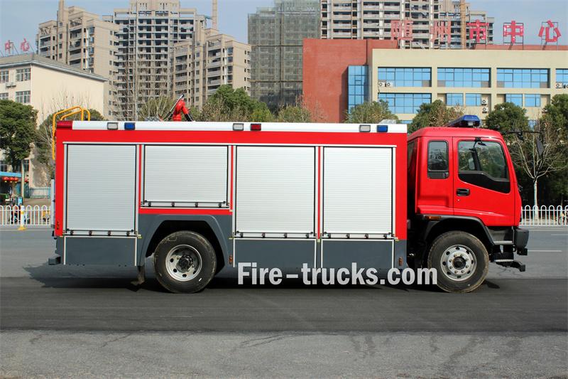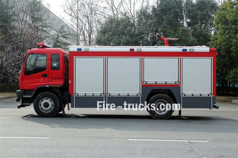 Water≥70 m,Foam≥60mCe Camion de pompiers Isuzu FVR 6HK1 en Albanie Ce camion de pompiers de taille moyenne, construit sur châssis Isuzu FVR 4×2, est équipé d'un moteur 6HK1 et d'une boîte de vitesses rapide, garantissant une puissance fiable. Ses réservoirs d'eau de 5 m³ et de mousse de 1 m³ répondent à divers besoins en matière de lutte contre l'incendie. Il intègre une pompe à incendie CB10/60 à haut débit, un canon à eau PL8/48 à longue portée et angle réglable pour un ciblage précis des foyers d'incendie, des tuyaux d'incendie et d'autres équipements auxiliaires, ainsi que divers équipements d'effraction et de sauvetage dans le compartiment prévu à cet effet, offrant un soutien optimal aux opérations de sauvetage.