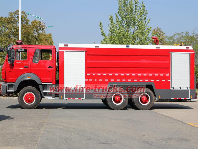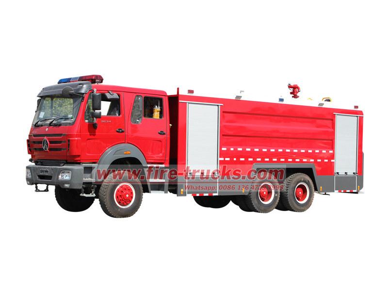 6×6 drive is optionalLe camion de pompiers Beiben 6×4 est un véhicule professionnel de lutte contre l'incendie intégrant un réservoir de produits extincteurs de grande capacité et des capacités d'extinction à haute efficacité. Il est spécialement conçu pour lutter contre les incendies dans les usines pétrochimiques, les aéroports, les ports et autres environnements spécialisés. Construit sur le châssis robuste Beiben ND1250, le véhicule mesure 10 110 × 2 550 × 3 800 mm et dispose d'une configuration 6×4. Propulsé par un moteur diesel Weichai de 340 chevaux couplé à une transmission à 12 rapports, il atteint une vitesse maximale de 98 km/h. Avec un poids brut de 31 tonnes et une répartition de la charge de 7,5 tonnes sur l'essieu avant et de 26 tonnes sur l'essieu arrière, ce camion offre une stabilité de charge exceptionnelle. Un angle d'approche de 26° et un angle de départ de 27°, combinés à des pneus de grande taille 12.00R20, garantissent des performances hors route supérieures sur des terrains difficiles.