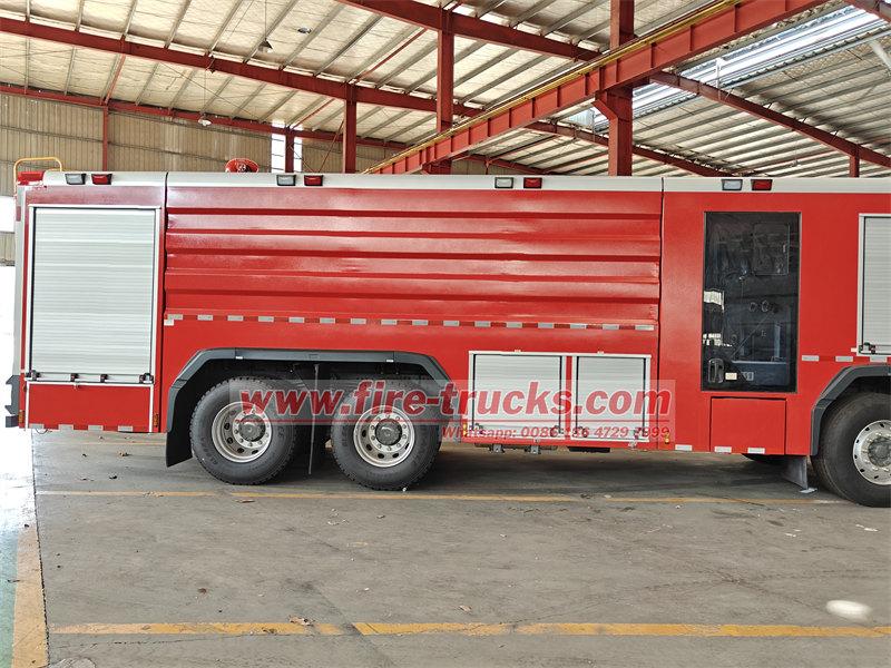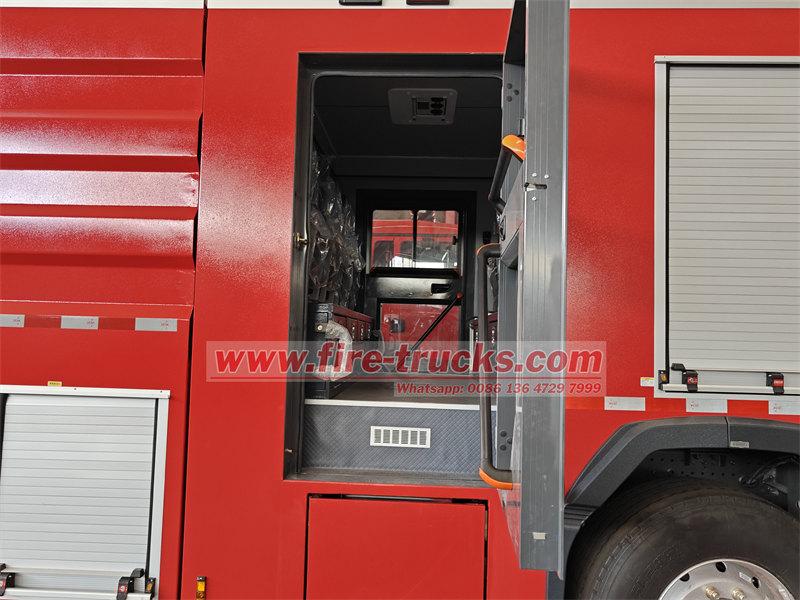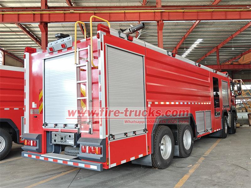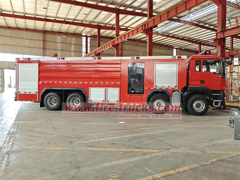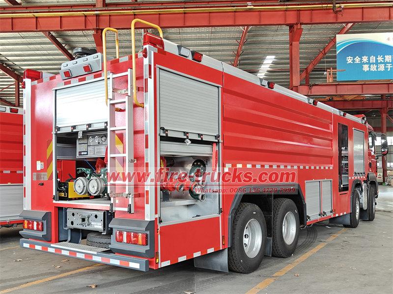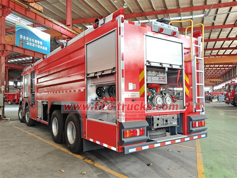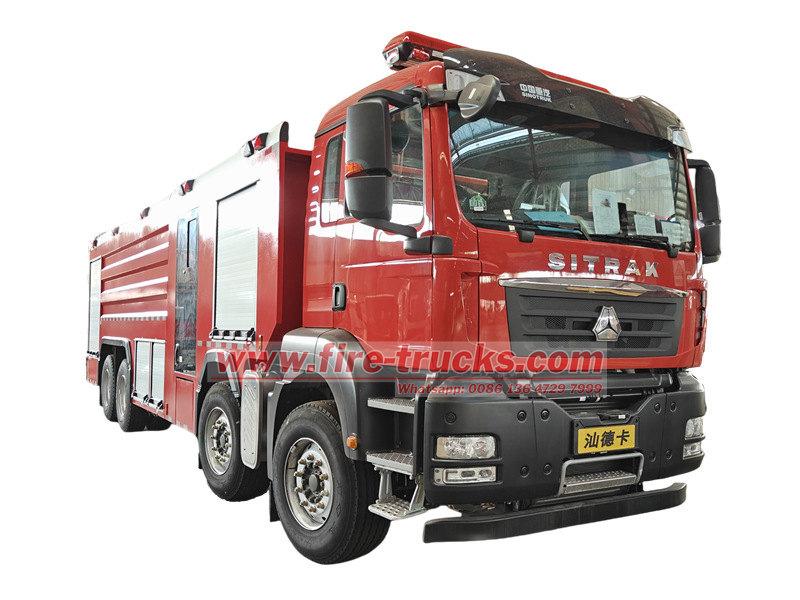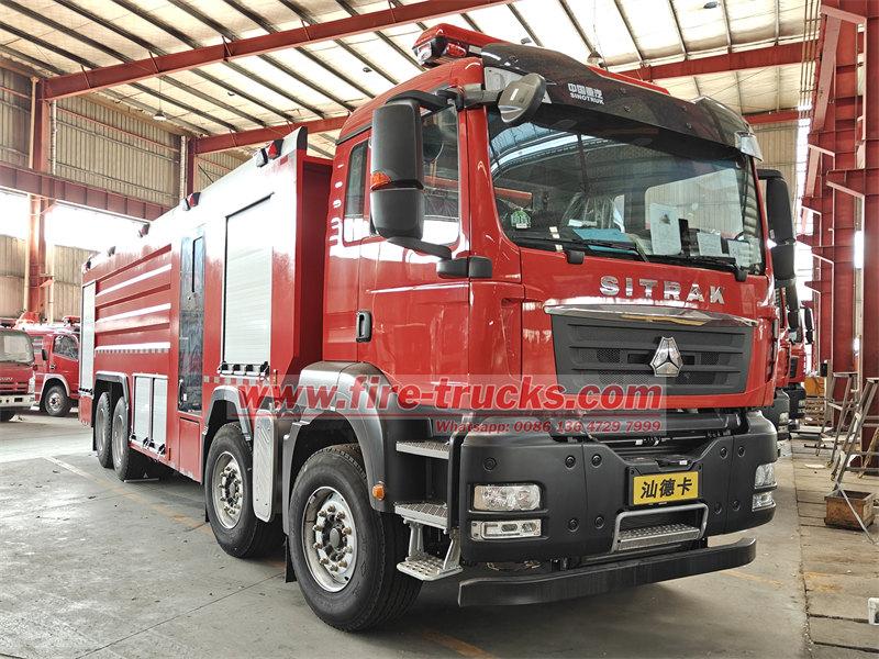 Le camion-citerne incendie POWERSTAR 8×4 est équipé d'un châssis SITRAK 8×4, d'une citerne, d'une pompe à eau, d'un système de tuyauterie, d'un circuit d'instrumentation et d'autres composants. Il est équipé d'une échelle arrière amovible en aluminium, d'un compartiment de pompe arrière et d'une citerne en acier soudé. Il peut contenir 12 m³ d'eau et 2 m³ de mousse. Le réservoir d'eau est en acier au carbone de haute qualité avec traitement anticorrosion interne, tandis que le réservoir de mousse est en acier inoxydable. Le camion est équipé d'une pompe incendie à pression normale CB10/100 et d'une lance d'incendie à double usage PL8/80.