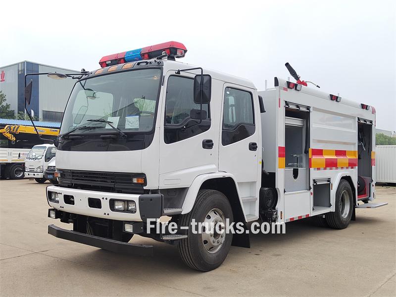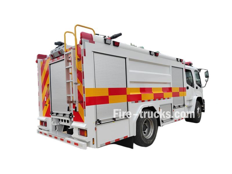 Le camion de pompiers à mousse Isuzu FVR de 6 mètres cubes utilise un châssis Isuzu FVR avec un empattement de 4 500 mm. Il est équipé d'un moteur Isuzu 6HK1-TCL, d'une transmission Fast à 8 vitesses, d'une citerne à eau de 5 tonnes en acier au carbone (traitée anticorrosion), d'une citerne à mousse de 1 tonne en acier inoxydable 304, d'une pompe à incendie basse pression Shanghai Xiongzhen CB10/40 (située dans la salle des pompes à l'arrière), d'un canon à eau Chengdu West PL32 et d'un dévidoir de tuyau moyenne pression de 30 mètres dans la salle des pompes.